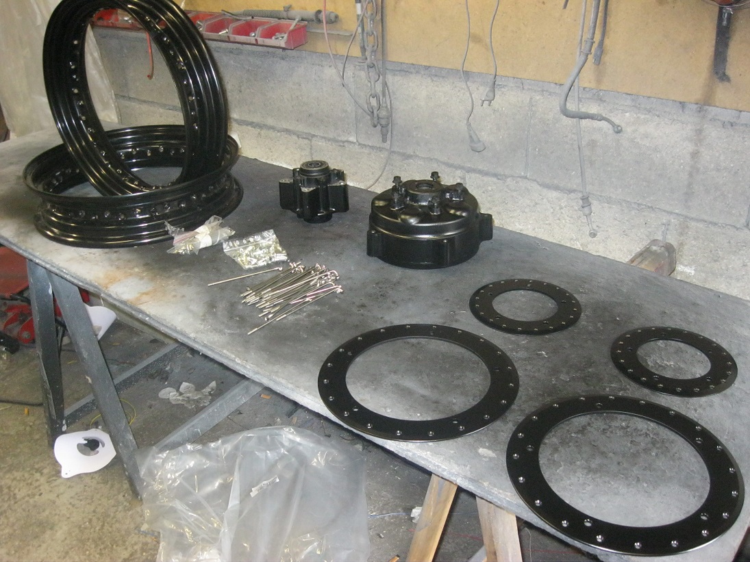 4 rondelles pleines de trous, une bonne grosse poignée de rayons inox , des cerceaux en 16 pouces et des moyeux de Goldwing YAPUKA
